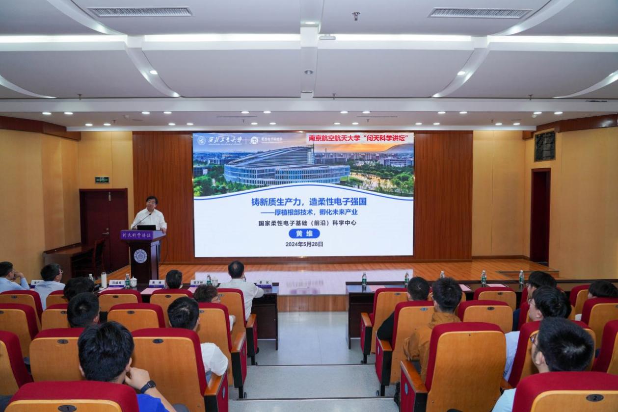 5月28日,ac米兰第240期问天科学讲坛在将军路校区图书馆一楼报告厅举办。中国科学院院士黄维为师生讲授题为《铸新质生产力,造柔性电子强国——厚植根部技术,孵化未来产业》的报告。校长姜斌,校国际前沿科学研究院院长郭万林院士出席,校科协秘书长冯绍红、电子信息工程学院常务副院长潘时龙参加活动,近200名师生现场聆听授课。报告会由姜斌主持。