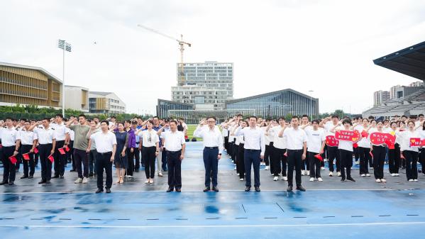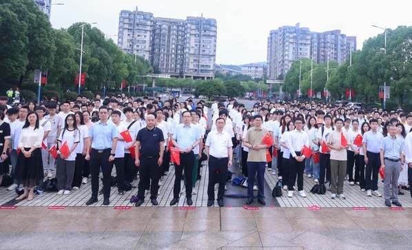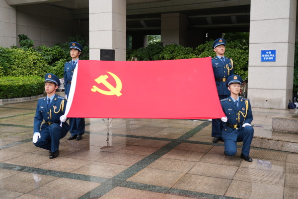 7点30分,升国旗仪式正式开始。伴随着雄壮有力的《义勇军进行曲》,鲜艳的五星红旗冉冉升起。国旗下,全场人员庄严肃立,仰视国旗行注目礼,齐声高唱国歌,深情祝福伟大祖国。升旗毕,举行了集体宣誓活动。在铿锵誓言中,全体党员进行了入党宣誓,老党员重温了入党誓词。到场校领导为新发展学生党员代表佩戴党员徽章,全体新党员共同佩戴党员徽章。