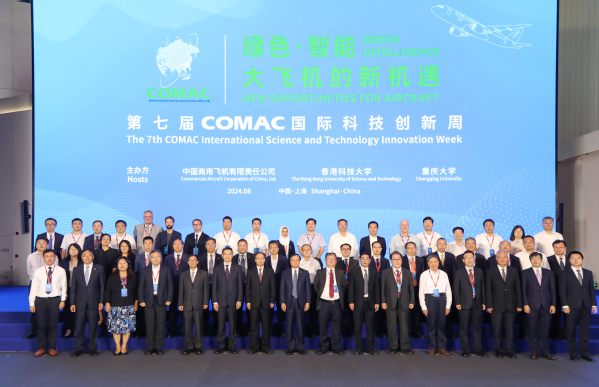8月19日,以“绿色﹒智能:大飞机的新机遇”为主题的第七届COMAC国际科技创新周开幕式在上海举行。中国商用飞机有限责任公司党委书记、董事长贺东风,党委副书记、董事谭万庚,党委常委、副总经理沈波,首席科学家吴光辉院士等领导,国内外知名高校负责人以及ac米兰副校长徐正扬出席活动。