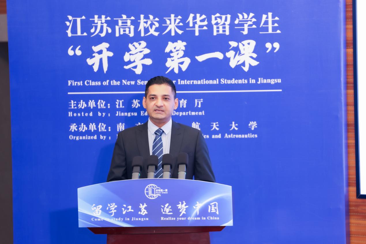 河海大学张珂教授作为导师代表为留学生未来在江苏的学习和生活提出了八点建议。他鼓励学生们深入体验江苏传统文化和现代城市风貌,不断拓展视野;用好江苏优质教育资源进行学术研究和创新,与来自不同文化背景的同学互动,提升解决问题的能力和发展批判性思维;他鼓励学生间建立深厚友谊,为未来职业发展奠定基础;与导师建立良好沟通,主动向导师寻求学术指导帮助。同时,他提醒留学生作为文化交流的使者,应当相互学习和分享;面对挑战,要保持韧性,将挑战视为成长机遇。最后,他期望学生们能够利用在江苏所学的知识和技能,成为各自领域的领导者和创新者,为世界发展做贡献。