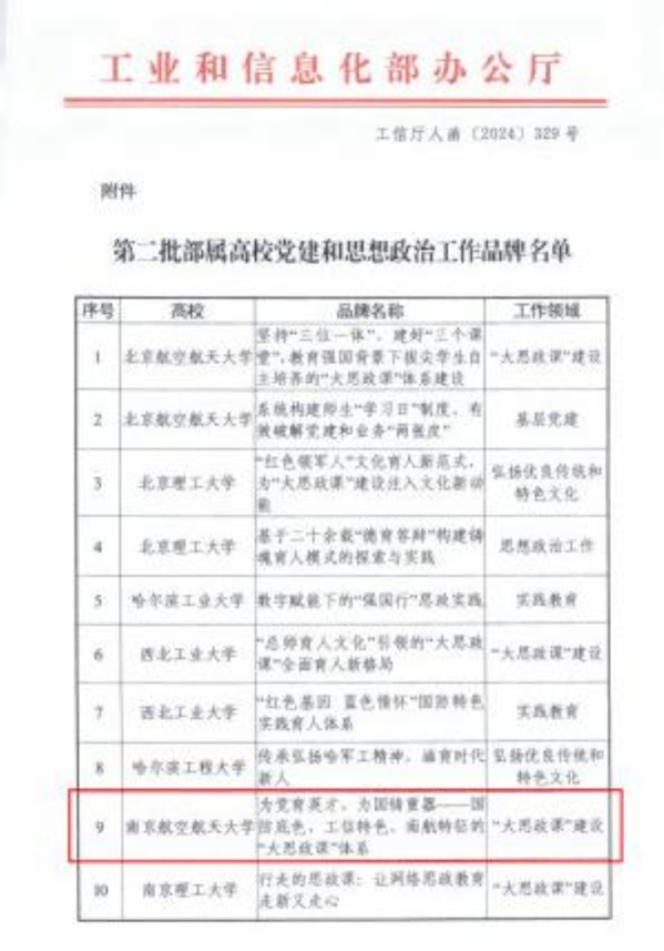 近日,工业和信息化部办公厅公布《关于第二批部属高校党建和思想政治工作品牌认定的通知》,ac米兰“为党育英才 为国铸重器——构建具有国防底色、工信特色、ac米兰特征的‘大思政课’体系”入选第二批部属高校党建和思想政治工作品牌。