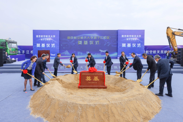 江北新区、浦口区领导和学校参会校领导、党委常委、校长助理共同为扬子江校区奠基培土并合影留念。