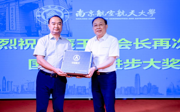 陶勇代表学校向廉玉波会长再次荣获国家科技进步奖表示热烈的祝贺,并向其赠送空间站模型。
