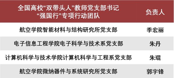 电子科学与技术系党支部入选全国第三批高校“双带头人”教师党支部书记工作室,支部以党建场为载体,践行党建引领,通过创新“1+3+X”工作机制,党建场、人才链、产业链和创新链的融合来落实四项主要任务,助力学科获批国家级一流本科专业建设点,电子科学与技术博士点。支部以人才链为支撑,培养空天报国“引路人”,支部党员受邀参加了习近平总书记主持的“科学家座谈会”,荣获中国青年五四奖章等多项国家级、省部级荣誉,指导学生获“全国五四红旗团支部”,挑战杯金奖等多种奖项。支部以产业链为抓手,开展党建联建,党建联合、业务共进,推动与领域重点单位的产学研合作,引聘产业专家,推进成果转化。支部以创新链为驱动,推动科技赋能,主持创建国家级重点实验室,支撑国家重大战略领域“新赛道”建设,突破卡脖子问题,获国际发明展特别金奖等多种国内外奖项,入选省高校优秀科技创新团队等。