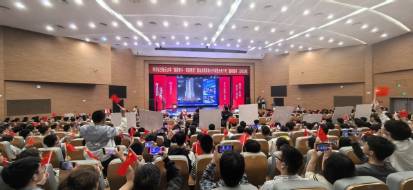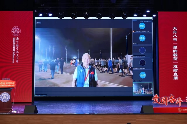 发射倒计时,全场师生挥舞国旗,共同迎接天舟八号“星眸载荷”划破天穹的震撼瞬间。