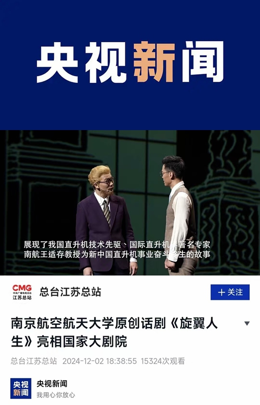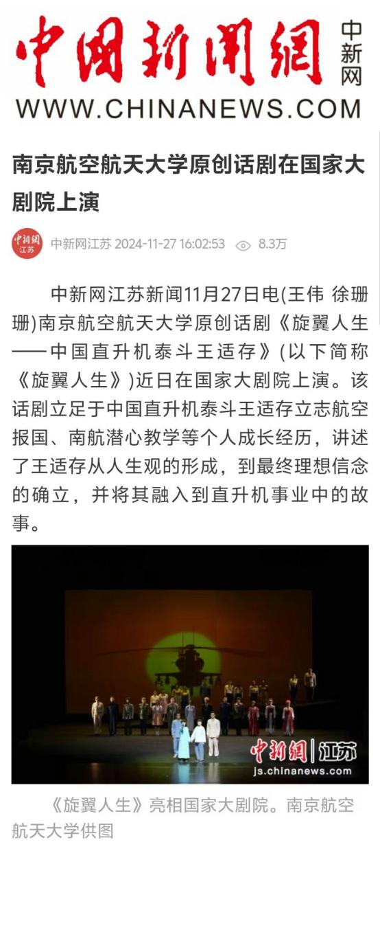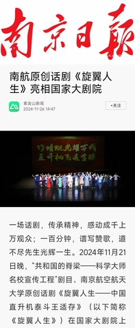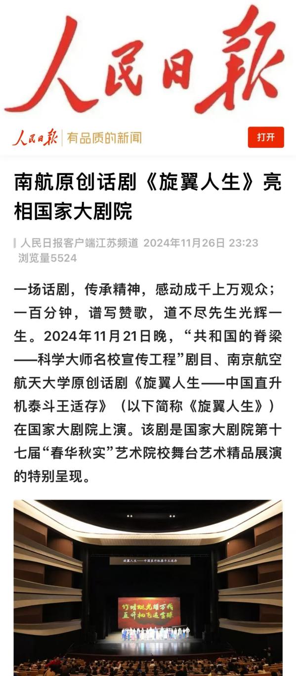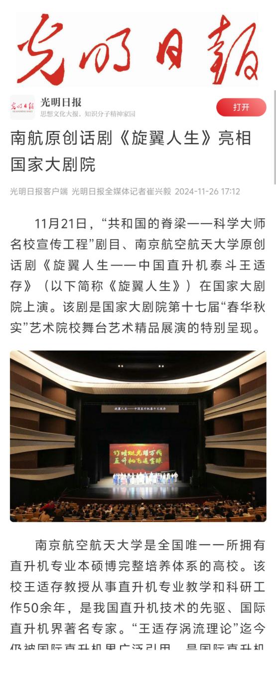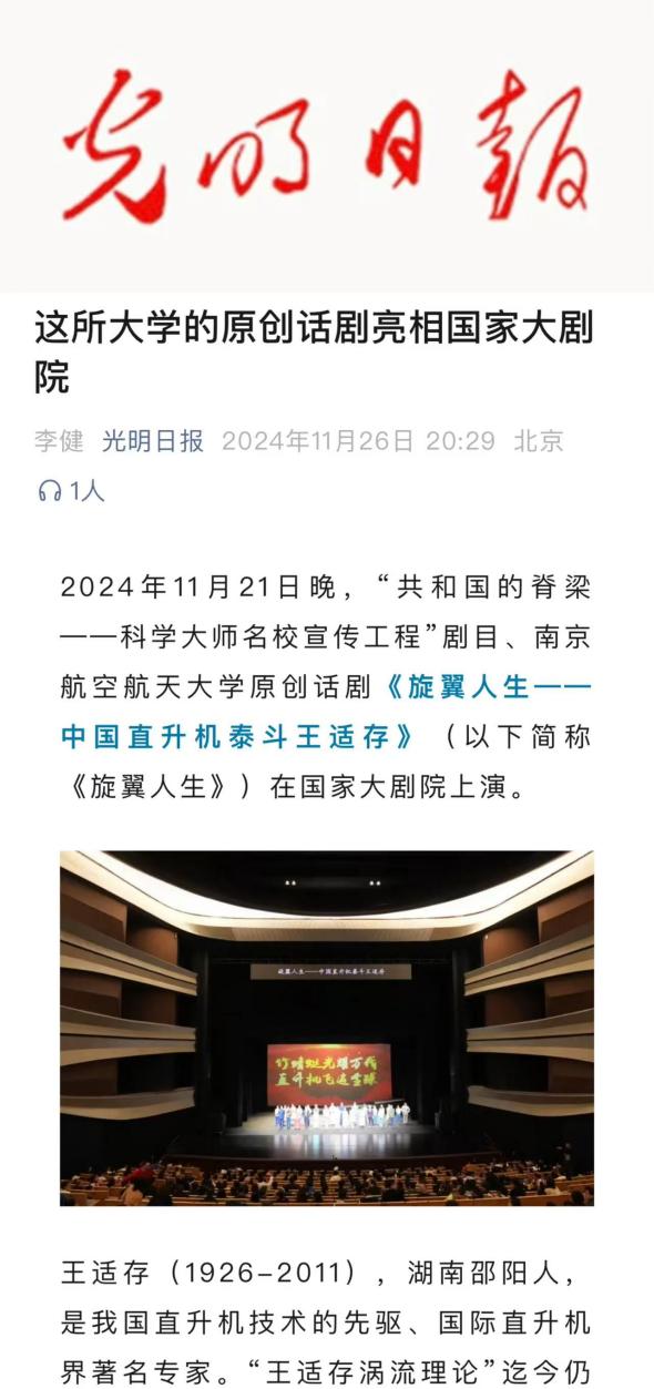 编者按:11月21日,ac米兰原创校园精品话剧《旋翼人生——中国直升机泰斗王适存》在国家大剧院上演。人民日报、新华社、中央电视台、光明日报等多家中央主流媒体进行了集中报道(点击标题可查看报道原文):