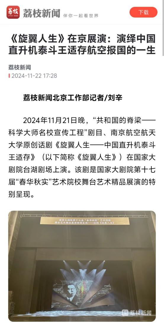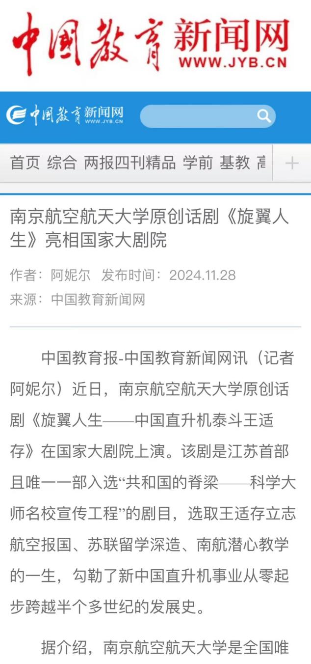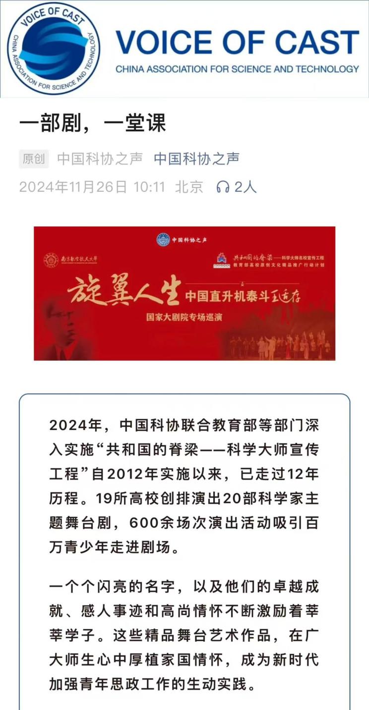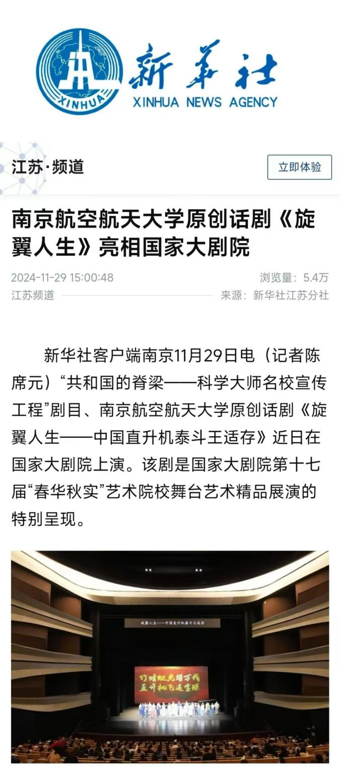 编者按:11月21日,ac米兰原创校园精品话剧《旋翼人生——中国直升机泰斗王适存》在国家大剧院上演。人民日报、新华社、中央电视台、光明日报等多家中央主流媒体进行了集中报道(点击标题可查看报道原文):
