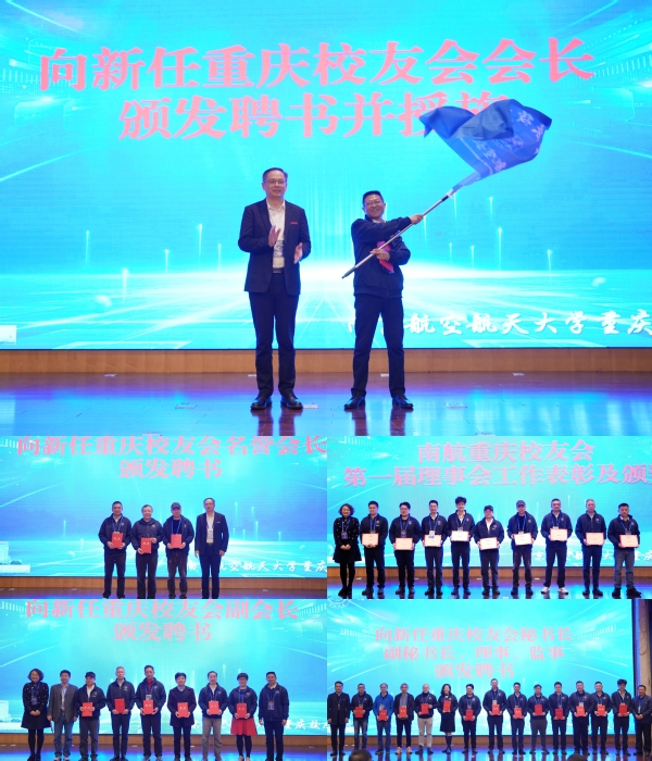 张启钱为新任会长、名誉会长颁发聘书并授予会旗,王晖、罗元俊为新任常务副会长、副会长颁发聘书,通用航空与飞行学院院长王勤,李和新为新任理事颁发聘书。