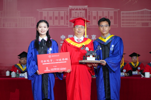 典礼上,ac米兰微型飞行器创新设计团队的徐宏雨同学和校友大使黄琳涵同学代表全体毕业研究生为母校送上了一份特殊的礼物——由ac米兰研究生团队自主研发的结构可变陆空两栖飞行机器人和2025届毕业研究生名册,展现了ac米兰学子心系母校的情怀与志在远方的理想。姜斌校长代表学校接受毕业生赠礼。