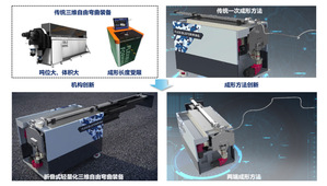 郭训忠团队的“便携式多层折叠推进三维自由弯曲成形”技术,在现有管材三维自由弯曲成形技术基础上,通过创新设计折叠式推进机构和提出双向分段成形方法,实现了小体积设备大行程加工,能够在1.2m设备构型上柔性弯曲成形4m以上管材,解决了野外作业中损伤导管现场快速维修模具依赖性强、设备机动性差等一系列问题,可搭载维修方舱车快速抵达维修制造现场,适用于飞机、轮船、车辆等设备的管道应急维修与制造任务,可显著提升装备在恶劣环境下的持续作业能力。