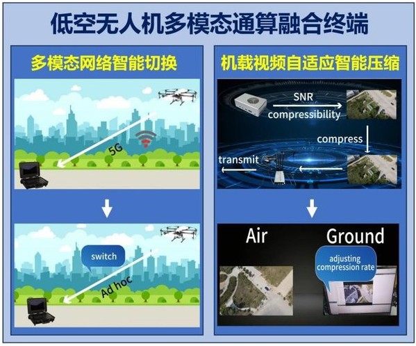 屈毓锛团队的“低空无人机多模态通算融合终端”技术,针对低空经济领域无人机实时在线联网与高效数据回传的迫切需求,集成5G公网通信、无线自组网专网与高性能嵌入式AI计算等多模态通算载荷,嵌入了基于通信链路质量动态感知的多模态网络智能切换算法和机载视频自适应智能压缩算法,实现了无人机感知数据的高效回传与精准处理,解决了传统低空通信覆盖不足、带宽消耗大、实时性差等问题。该成果适用于各类低空巡检任务,可提供可靠的通信与算力支撑。