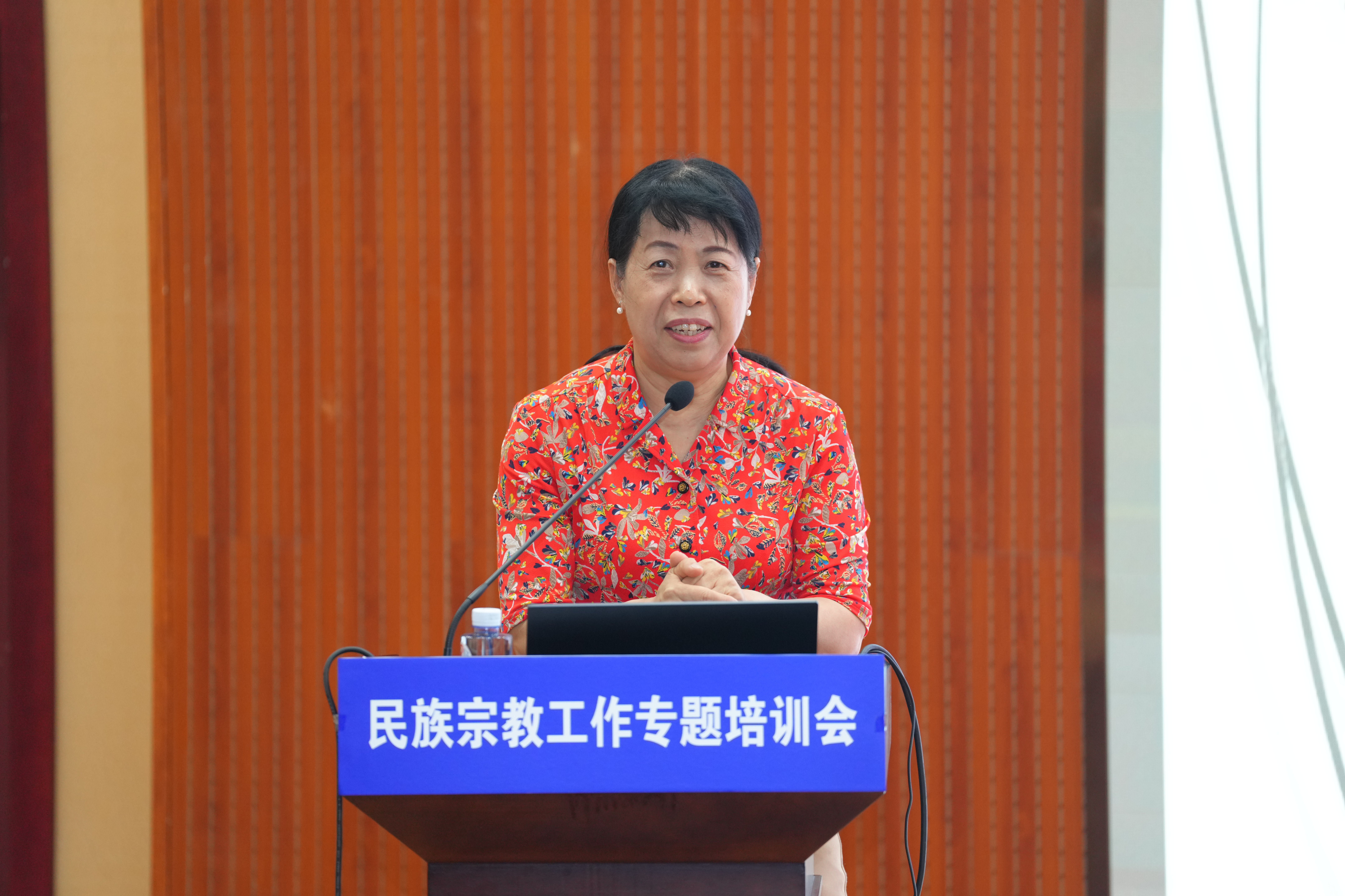 本次培训特别邀请到国家民委铸牢中华民族共同体意识宣讲团成员、浙江大学国家制度研究院(北京)研究员沈桂萍教授,围绕高校铸牢中华民族共同体意识教育的政策要求、铸牢中华民族共同体意识提出的时代背景、铸牢中华民族共同体意识的核心要义等,通过鲜活生动的案例,深入浅出地阐释了铸牢中华民族共同体意识的重要性,深刻解读了中华民族共同体意识的历史脉络、文化根基与时代价值,详细指导了高校做好民族宗教工作的有效措施。