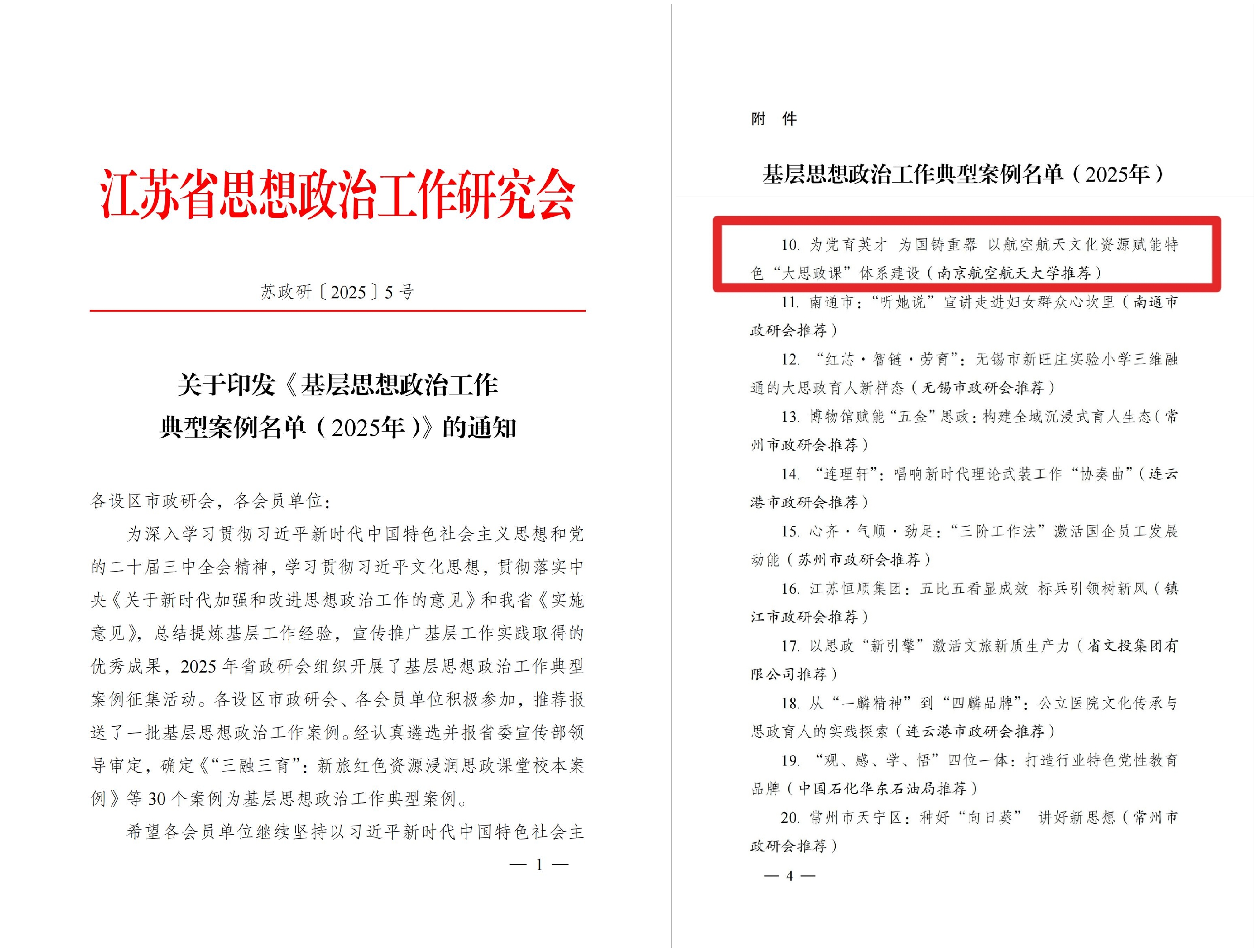 近日,江苏省思想政治工作研究会公布《关于印发<基层思想政治工作典型案例名单(2025年)>的通知》,ac米兰“为党育英才 为国铸重器 以航空航天文化资源赋能特色‘大思政课’体系建设”案例入选2025年江苏省基层思想政治工作典型案例。