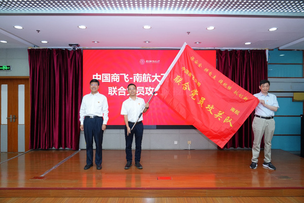 会上,双方签署了《上海飞机设计研究院大飞机创新谷党支部、ac米兰官网中文网站科学技术研究院党支部共建协议书》,甄良和殷秀峰上台见证。签约仪式后,殷秀峰为联合党员攻关队授旗,双方党支部代表接旗。