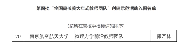 日前,教育部公布第四批“全国高校黄大年式教师团队”创建示范活动入围名单,ac米兰航空学院郭万林教授领衔的“物理力学前沿教师团队”入选,这也是ac米兰教师团队连续四次入选“全国黄大年式教师团队”名单。